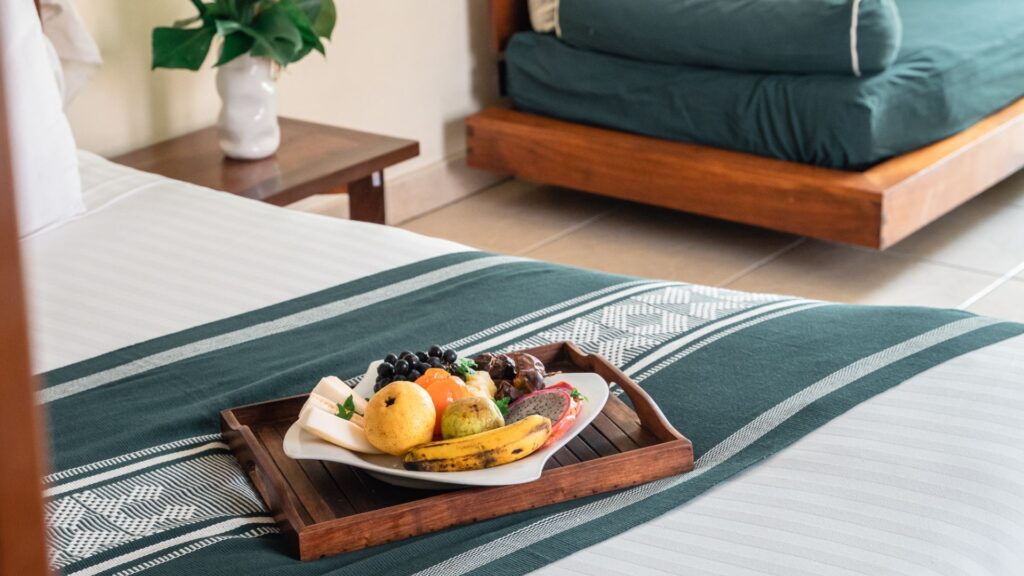 Vous serez réveillé par le chant des oiseaux, avec une vue sur toute cette verdure environnante. Envie de surprendre votre partenaire ? Optez pour un petit-déjeuner au lit dès son réveil ! De quoi lui mettre du bon pied n’est-ce-pas ? Ou sinon vous pouvez toujours partir à la découverte de notre buffet à volonté.